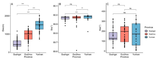 Differences in topographic factors in the subgenus of Brachypetalum, distributed in different provinces. (A) The differences in elevation in each province. (B) The differences in slope in each province. (C) The differences in aspect in each province. Note: ns represents not significant; ** represents 0.01 level of significance; *** represents 0.001 level of significance.