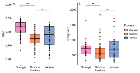 The Wilcoxon rank sum test revealed extremely significant differences (p < 0.001) in the normalized difference vegetation index (NDVI) between Guangxi and Guizhou, as well as Guangxi and Yunnan (Figure 5A). However, in terms of net primary production (NPP), there was only a significant difference (p < 0.01) between Guangxi and Guizhou (Figure 5B).
