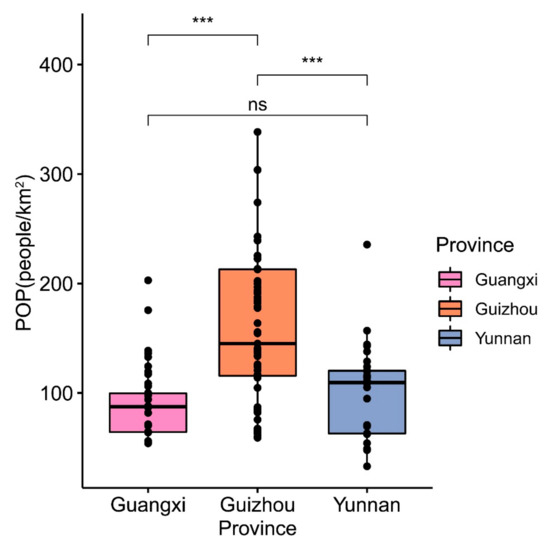 In consideration of multicollinearity, we only introduced population density (POP) as a factor. The results indicated that no significant difference (p > 0.05) was observed in population density among Guangxi and Yunnan. However, there were very significant differences (p < 0.001) in population density between the other two provinces and Guizhou, respectively (Figure 6).