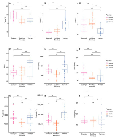 The differences in climatic factors in the subgenus of Brachypetalum, distributed in different provinces. (A) The differences in average temperature in each province. (B) The differences in the mean diurnal range in each province. (C) The differences in the annual temperature range in each province. (D) The differences in precipitation seasonality in each province. (E) The differences in the precipitation of the warmest quarter in each province. (F) The differences in the precipitation of the coldest quarter in each province. (G) The differences in precipitation in each province. (H) The differences in solar radiation in each province. (I) The differences in wind speed in each province. Note: ns represents not significant; * represents 0.05 level of significance; *** represents 0.001 level of significance.