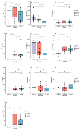 The differences in edaphic factors in the subgenus of Brachypetalum, distributed in different provinces. (A) The differences in pH value in each province. (B) The differences in soil moisture in each province. (C) The differences in soil organic matter in each province. (D) The differences in total N in each province. (E) The differences in total P in each province. (F) The differences in total K in each province. (G) The differences in alkali-hydrolysable N in each province. (H) The differences in the available P in each province. (I) The differences in the available K in each province. (J) The differences in exchangeable Ca2+ in each province. Note: ns represents not significant; * represents 0.05 level of significance; ** represents 0.01 level of significance; *** represents 0.001 level of significance.