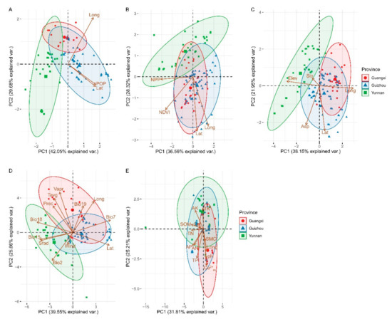 Principal component analysis (PCA) of longitude, latitude, and environmental factors in the subgenus of Brachypetalum, distributed in different provinces. (A) PCA based on the human activity of different provinces. (B) Productivity-based PCA of different provinces. (C) Topography-based PCA of different provinces. (D) Climate-based PCA of different provinces. (E) Soil-based PCA of different provinces. In the figure above, the PC1 axis is the first principal direction along which the factors show the largest variation. The PC2 axis is the second important direction and is orthogonal to the PC1 axis.