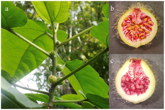 (a). Ficus hirta tree with its figs grow on the branch. (b). Female fig of Ficus hirta. (c). Functional male fig of Ficus hirta.