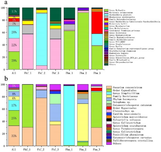 From Figure 2a and Table S1, we can see that Wolbachia almost only exists in the functional male figs sequence library with 64.32% ± 26.90% abundance, while in the female figs library the abundance is 0.17% ± 0.16%. Ralstonia solanacearum and Burkholderia gladioli’s sequences mainly exist in female figs with 37.37% ± 27.20% and 28.39% ± 48.35% abundance, but for functional male figs, abundances are 1.83% ± 1.24% and 6.29% ± 10.84%. Then, Rhodococcus erythropolis and Enterobacteriaceae exist in all six samples’ sequence libraries, with 6.95% ± 7.26% and 6.15% ± 14.62% abundance in all libraries. But Enterobacteriaceae has a prominent quantity merely in Fhm_3, which is 35.99%, and in the rest of the groups, the abundance is 0.18% ± 0.22%. Moreover, Burkholderia-Caballeronia-Paraburkholderia and Rickettsia bellii also exhibit distribution bias between functional male and female figs, of which Burkholderia-Caballeronia-Paraburkholderia has 5.11% ± 0.76% abundance in female figs libraries and 0.62% ± 0.50% abundance in functional male figs. Rickettsia bellii only exists in Fhm_1 and Fhm_2 with 4.48% and 3.10% abundance.