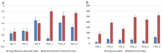 (a) Shannon diversity index clustered column chart of fungi and bacteria; (b) Ace index clustered column chart of fungi and bacteria.