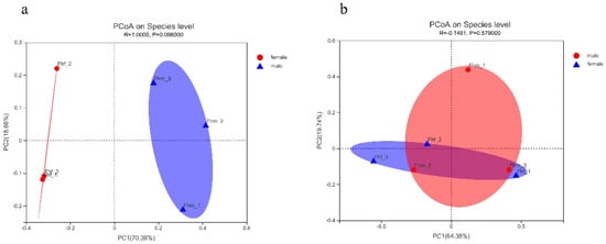 The similarity of species between female and functional male figs was further calculated by PCoA analysis (Figure 4a,b). Bacteria are disparate in two types of figs; however, fungi are overlapped. The results of PERMANOVA analysis between different groups are similar to that of PCoA (Table S3). For bacteria, the R2 value between female and functional male figs is the highest (R2 = 0.5908), showing bacteria community divided by gender is more reliable than any other grouping modes, while for fungi it seems that communities do not vary with the fig’s gender.