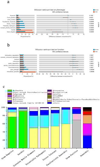 (a,b) are clustered column charts of difference test of phenotype and function between male and female figs microbial communities; (c) is a percentage stack bar chart of phenotype contribution of several main bacteria in total samples for a phenotype.