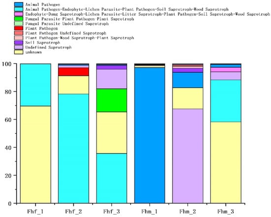 Fungi in figs are mainly animal pathogen, endophyte, lichen parasite, plant pathogen, soil saprotroph, and wood saprotroph; but many are still functionally unknown (Figure 6). Then it is also worth noting that animal pathogen is prominently rich in Fhm_1, and species annotation results show that the Simplicillium fungi make up 96.86% proportion in Fhm_1 (Table S2). Accordingly, we can speculate Simplicillium may be a type of endophyte in the fig wasp.
