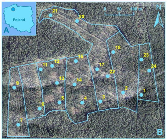 Study area: (A) locality of the “Bory Tucholskie” National Park in Poland; (B) twenty sampling plots in experimental area of the lichen Scots pine forest habitat in “Bory Tucholskie” National Park. Blue line indicates forest stands (© The Head Office of Geodesy and Cartography, www.geoportal.gov.pl).