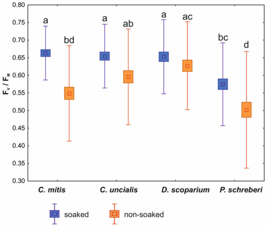 Mean ± SE and SD of FV/FM, including division into species (C. mitis, C. uncialis, D. scoparium, and P. schreberi) and sample type (soaked or non-soaked). The results of ANOVA (p < 0.05) are presented graphically (N = 4320). The lowercase letters indicate the statistically significant interaction between habitat type and location (see Table 1 for details on the main effects and interactions).