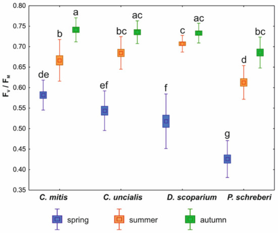 Mean ± SE and SD of FV/FM, including division into species (C. mitis, C. uncialis, and D. scoparium, P. schreberi) and season (spring, summer, and autumn). The results of ANOVA (p < 0.05) are presented graphically (N = 2160). The lowercase letters indicate the statistically significant interaction between species and season (see Table 1 for details on the main effects and interactions).