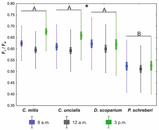 Mean ± SE and SD of FV/FM, including division into species (C. mitis, C. uncialis, D. scoparium, and P. schreberi) and daytime (8:00 a.m., 12:00 a.m., and 3:00 p.m.). The results of ANOVA (p < 0.05) are presented graphically (N = 2160). The capital letters show the significant main effect of the species; the asterisk (*) indicates the significant main effect of daytime (see Table 1 for details on the main effects and interactions).
