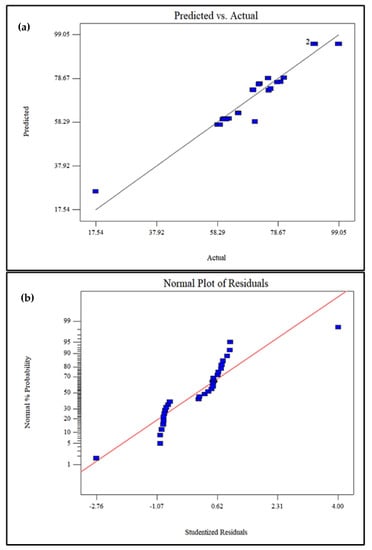 Diagnostic plots of the central composite design model of phenol degradation by the binary consortium. (a) Similarity plot between predicted and actual values for phenol degradation; (b) Normal probability plot against residuals for phenol degradation.