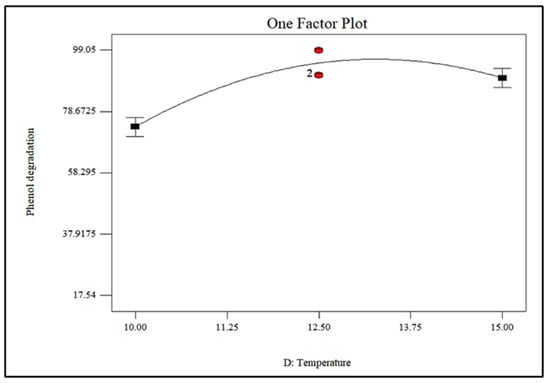 The one-factor plot showing the significant effect of temperature on phenol degradation by the binary consortium.