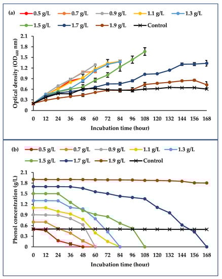 (a) Bacterial growth and (b) degradation of different initial concentrations of phenol by the binary consortium under optimized conditions (0.40 g/L (NH4)2SO4, 0.13 g/L NaCl, pH 7.25, 12.50°C). The control (cross mark) shows the initial phenol concentration in the absence of the bacterial strain. Error bars represent the mean ± standard deviation of three replicates.