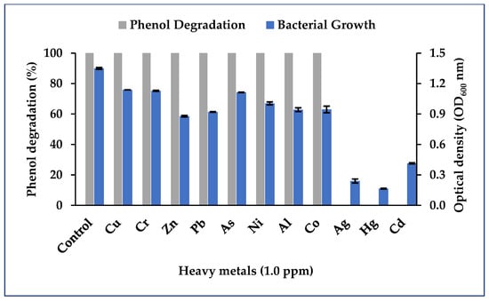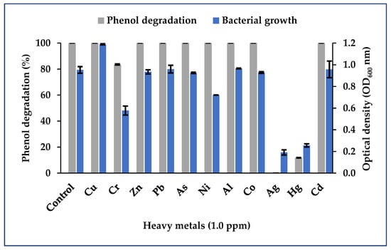 Effects of 1.0 ppm concentration of different heavy metals on phenol degradation and growth on the binary consortium. Error bars represent the mean ± standard deviation of three replicates.