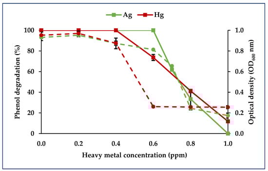 Effects of exposure to different concentrations of Ag and Hg on phenol degradation (solid line) and growth (dotted line) of Arthrobacter sp. strain AQ5-06. Error bars represent the mean ± standard deviation of three replicates.