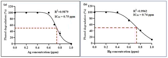 Dose-response curves identifying IC50 values for Arthrobacter sp. strain AQ5-06 phenol degradation after 120-h exposure to different concentrations of (a) Ag and (b) Hg.