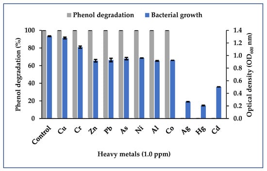 Phenol degradation and growth of Arthrobacter sp. strain AQ5-15 in the presence of 1.0 ppm concentrations of different heavy metals. Error bars represent the mean ± standard deviation of three replicates.
