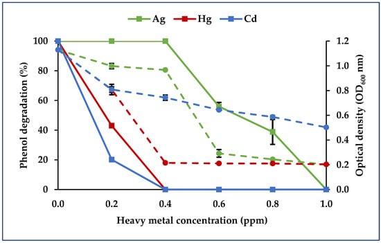 Effects of different concentrations of Ag, Hg, and Cd on phenol degradation (solid line) and growth (dotted line) of Arthrobacter sp. strain AQ5-15. Error bars represent the mean ± standard deviation of three replicates.