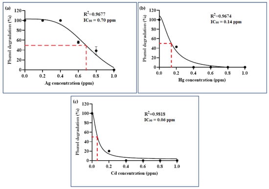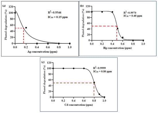 Dose-response curves indicating IC50 values for the binary consortium phenol degradation after 48-h exposure to different concentrations of (a) Ag, (b) Hg, and (c) Cd.