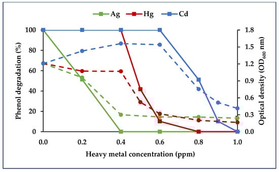 The influence of exposure to different concentrations of Ag, Hg and Cd on phenol degradation (solid line) and the growth (dotted line) of the binary consortium.