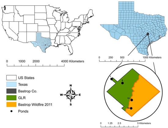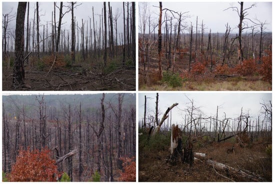 Our study area is located at the Griffith League Ranch, Bastrop, Texas, with centroid latitude and longitude of 30.196121 N, −97.229185 W (WGS84 coordinate system) and elevation of 184 m, within the Lost Pines ecoregion and the range of the 2011 Bastrop wildfire (Figure 2). The ranch is approximately 1948 ha. As a result of the 2011 wildfire, which burned for 55 days, 50.7% of the ranch was burned in September and another 4.1% was burned in October []. On the unburned areas, the overstory vegetation is dominated by loblolly pine, eastern red cedar (Juniperus virginiana), and post oak (Quercus stellata), and the understory is dominated by yaupon holly (Ilex vomitoria), American beautyberry (Callicarpa americana), and farkleberry (Vaccinium arboreum) []. On the burned areas, the wildfire resulted in a mean overstory tree mortality of 87% and a mean pole-sized tree mortality of 97%, which was categorized as a high-severity fire based on metrics designed by Ryan and Noste [], Turner et al. [], and Ryan []. Even though the overstory vegetation is recovering slowly on the burned areas, the understory is recovering more rapidly with poke weed (Phytolacca americana), panic grasses (Dicanthelium spp.), and sedges (Cyperus spp.) [].