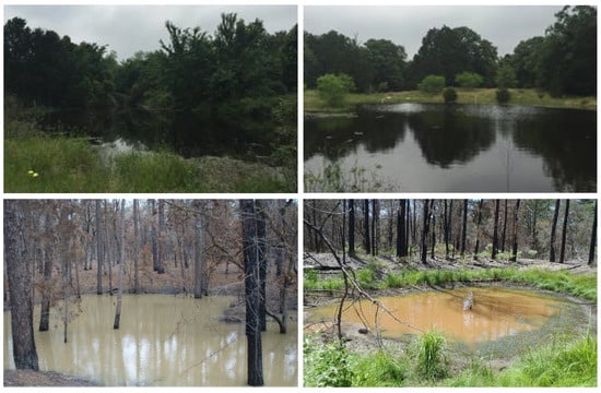Ponds sampled on the Griffith League Ranch in Bastrop County, Texas. Ponds 1 (top left) and 5 (top right) are located in the unburned areas (photos by Andrea Villamizar-Gomez and Ivana Mali). Ponds 13 (bottom left) and 14 (bottom right) are located in the burned areas (photos by Donald J. Brown and Ivana Mali).