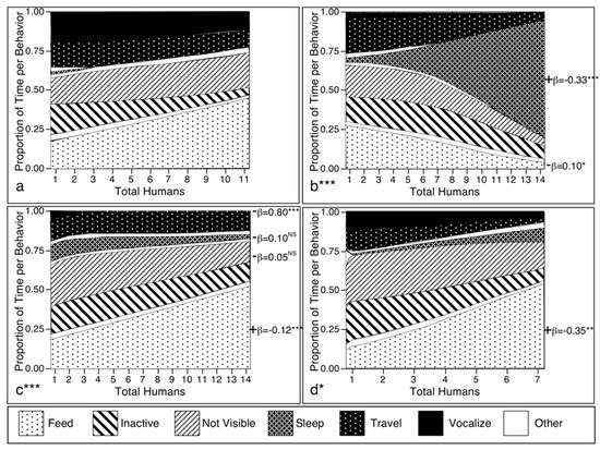 Low-impact human-wildlife interactions such as wildlife viewing impact animals in many ways, resulting in changes to behavior (e.g., Rangifer tarandus [1]; Rhinoceros unicornis [2]; Ursa actos [3]), habitat use (e.g., Tursiops spp. [4,5]), physiology (e.g., Opisthocomus hoazin [6]), community interactions (e.g., avian scavengers [7]), and population demographics (e.g., Monachus schauinslandi [8]. Among primate species, behavioral shifts in response to human presence are consistent with responses to predation, even in the absence of hunting or trapping [9,10,11,12,13,14,15]. Modified behavior can include differences in microhabitat use (e.g., tree canopy strata), suppressed vocalization, and reduced feeding, traveling, and sociality (e.g., Alouatta pigra [16,17]; Callithrix pygmaea [18]; Gorilla gorilla gorilla, [19]; Hylobates lar and Presbytis melalophos [20,21]).