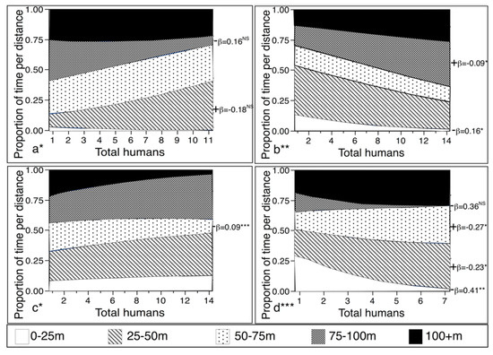 Distance from humans at varying numbers of humans present for (a) Group A; (b) Group B; (c) Group C; and (d) Group D. The area between the curves predicts the proportion of time the gibbon spends at each distance. Distances correspond to the key at the bottom of the figure. Individual distances that changed significantly with changing numbers of humans are indicated with either a + (time at distance increases in frequency as number of humans increase) or a − (time at distance decreases in frequency as number of humans increases). For p values, NS: <0.1, *: <0.05, **: <0.01, ***: <0.001.