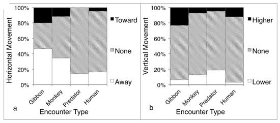 This prediction was supported. We observed 538 encounters, 394 encounters with humans, 93 encounters with monkeys, 30 encounters with gibbons from other groups, and 21 encounters with predators (raptors). Gibbons moved horizontally both towards (N = 6, χ2 = 7.94) and away from other gibbons (N = 14, χ2 = 9.19) more than expected by χ2 probabilities assuming that encounter type did not affect gibbon movement. They also moved away from monkeys more than expected (N = 32, χ2 = 7.67) and away from humans less than expected (N = 65, χ2 = 4.09). They maintained their horizontal position less than expected when encountering other gibbons (N = 10, χ2 = 6.26) and monkeys (N = 50, χ2 = 4.34) (Figure 4; N = 538, χ2 = 17.201, df = 6, p < 0.0001). For all encounter types, gibbons moved away from the encountered individual(s) more often than they moved towards it, however for both humans and predators, the vast majority of the gibbons’ responses were to not change their horizontal position, whereas with other gibbons and monkeys they did change their horizontal position a much larger proportion of the time.