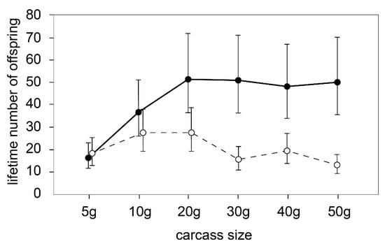 Mean lifetime number of offspring (error bars are 95% confidence interval) produced by N. marginatus (solid circle and line) and N. guttula (open circles and dashed line) across six carcass sizes.