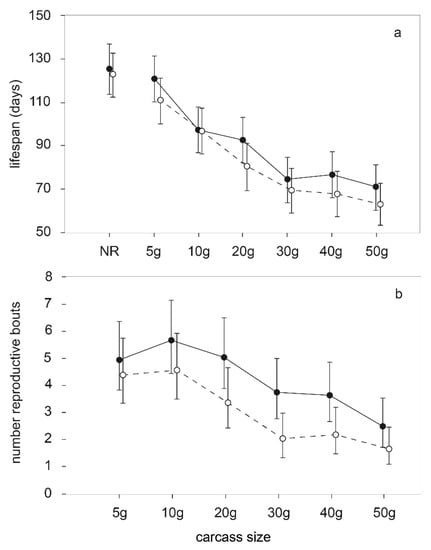 Reproduction is costly for both N. marginatus and N. guttula. Females that did not reproduce lived longer than those that reproduced, and lifespan and number of reproductive bouts decreased with increasing carcass size, suggesting that reproduction on larger carcasses may incur greater reproductive costs than on smaller carcasses. Resource quality also affected the rate of senescence. Both species had declining brood sizes on larger carcasses as they aged, although the rate at which brood sizes declined varied between species. Brood sizes of N. marginatus on larger carcasses declined more rapidly across bouts than N. guttula. However, N. marginatus initially produced significantly larger broods on larger carcasses. The pattern of declining brood size in later reproductive bouts observed in this study is consistent with previous work on N. orbicollis [,]. Interestingly, both species in our study reach a similar limit on the decline in lifespan on carcasses ≥ 30 g. Lifespans of these two species are remarkably similar to those observed in N. orbicollis []. Even though the two species in this study showed substantially different patterns of allocation and reproductive output on larger carcasses, the lower limit on lifespan of reproducing females is quite similar. Reproductive females may reach a limit where they are providing all they can to reproduction and further increases in time or energy are simply not possible. Handicap experiments that focus on changes in reproductive effort with reduced effort of the partner come to a similar conclusion []; females cannot increase reproductive effort to fully compensate for lack of male effort because they are already expending energy and time at a maximal level []. Interestingly, senescence does not follow the same pattern as fitness (lifetime number of offspring), especially in N. guttula. For both species, larger carcasses incur a progressively larger cost, but do not yield increased reproductive output.