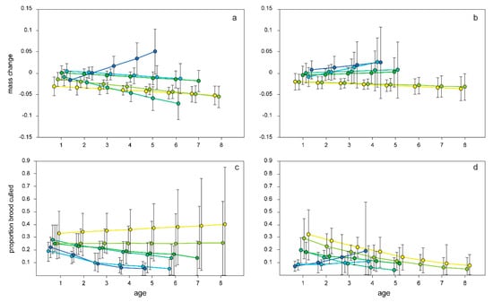 (a) Mean mass change (in grams, error bars are 95% confidence intervals, same on all panels) of female N. marginatus during reproduction on six carcass sizes (5 g = yellow, 10 g = yellow/green, 20 g = green, 30 g = blue/green, 40 g = light blue, 50 g = dark blue; same on all panels) by reproductive bout as age. (b) Mean mass change of female N. guttula during reproduction on six carcass sizes by reproductive bout as age. (c) Mean proportion of the brood culled by female N. marginatus on six carcass sizes by reproductive bout as age. (d) Mean proportion of the brood culled by female N. guttula on six carcass sizes by reproductive bout as age.