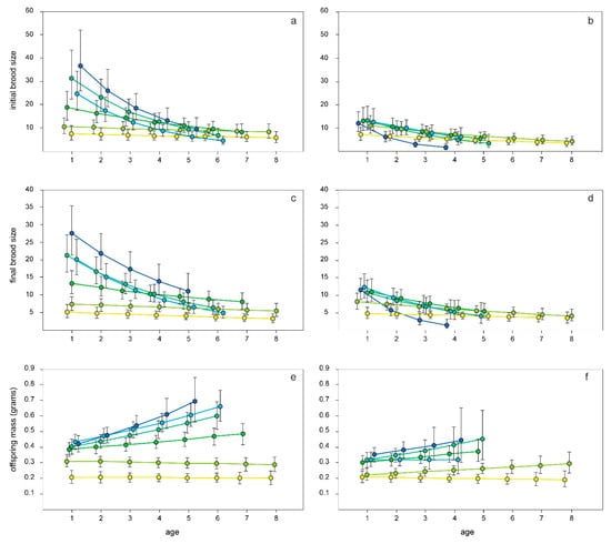 (a) Mean initial brood size (error bars are 95% confidence intervals on all panels) of N. marginatus across six carcass sizes (yellow circles represent the smallest carcass sizes grading to blue for the largest carcass sizes; same across all panels) by reproductive bout as age. (b) Mean initial brood size of N. guttula across six carcass sizes by reproductive bout as age. (c) Mean final brood size of N. marginatus across six carcass sizes by reproductive bout as age. (d) Mean final brood size of N. guttula across six carcass sizes by reproductive bout as age. (e) Mean offspring mass of N. marginatus across six carcass sizes by reproductive bout as age. (f) Mean offspring mass of N. guttula across six carcass sizes by reproductive bout as age.