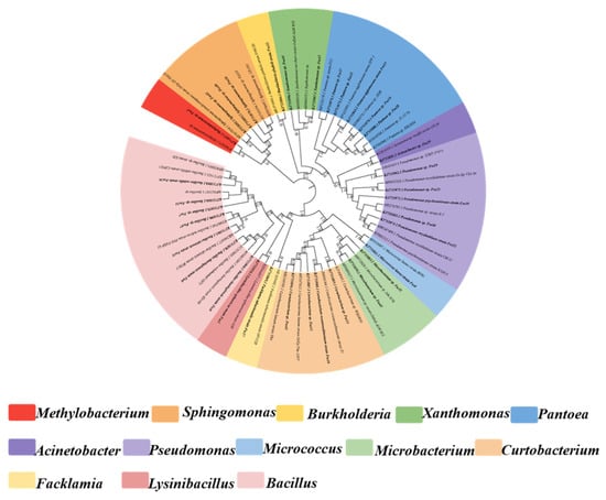 Plants can establish relationships with other members of their ecosystem, enjoying benefits to their growth and development while providing an ecological niche for thriving microorganisms [1,2]. Endophytes are microorganisms that inhabit the various tissues and organs of some or all stages of healthy plants and do not cause substantial damage to the host plant [3]. Researchers have successfully classified and reported more than 200 genera of endophytic bacteria from different plant tissues [4]. Endophytic bacteria sometimes provide multiple benefits to host plants, such as stimulation of plant growth by promoting biological nitrogen fixation, phosphate solubilization, phytohormone production (indole-3-acetic acid (IAA) and gibberellins), ACC deaminase activity, and enhancing antagonism against plant pathogens [5,6,7,8]. As a new agricultural resource, the study of endophytic bacteria and their interactions with plants has attracted much attention recently in the fields of plant science, agronomy, thermology, and ecology [9,10].