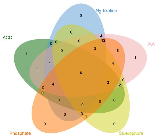Venn diagram showing the distribution of seed-colonizing endophytic bacteria with different PGP traits isolated from DXWR seeds.