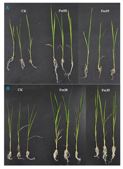 Bacteria can help plants to withstand stress by reducing the level of the stress hormone ethylene through the activity of the enzyme ACC deaminase which hydrolyses ACC into α-ketobutyrate and ammonia instead of ethylene [72]. Organisms with ACC deaminase activiy of 0.062–2.664 μmol α-ketobutyrate mg−1 protein h−1 or higher can promote host plant growth [73]. In our study, among the 47 isolates, 17 strains were identified with ACC deaminase activity of 2.12–20.72 μmol α-ketobutyrate mg−1 protein h−1, where Fse28 and Fse35 had the highest ACC deaminase activities of 19.51 ± 1.64 and 20.72 ± 1.89 μmol α-ketobutyrate mg−1 protein h−1, respectively (Table 2). In addition, Fse28 and Fse35 have five PGP traits, such as IAA production, siderophore-producing, nitrogen fixation, phosphorus solubilization, and ACC deaminase activities. PGP validation experiments found that Fse28 (Pantoea sp.) and Fse35 (Curtobacterium sp.) significantly improved the agronomic traits of cultivated rice seedlings (Figure 4). Pantoea spp. has been reported to enhance plant development and improve the photosynthetic efficiency of crops [74], and Curtobacterium spp. could improve the drought resistance and metal tolerance of plants [75,76]. These studies suggested that the endophytic bacteria Fse28 and Fse35 could potentially be used to stimulate tolerance to environmental stress and promote plant growth.