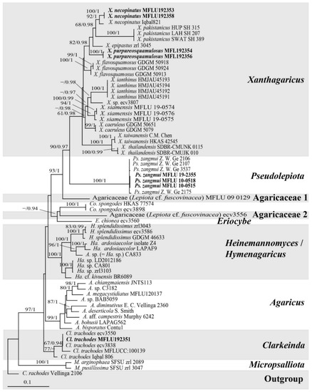 - Kumla, J.; Suwannarach, N.; Sringernyuang, K.; Lumyong, S. Xanthagaricus thailandensis sp. nov. (Agaricales, Basidiomycota), from northern Thailand. Phytotaxa 2018, 348, 109–117. [Google Scholar] [CrossRef]