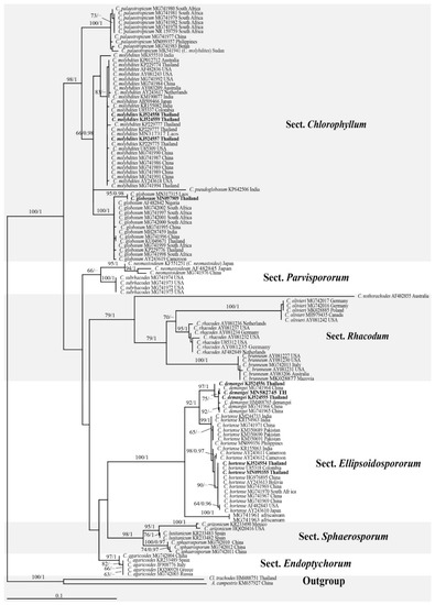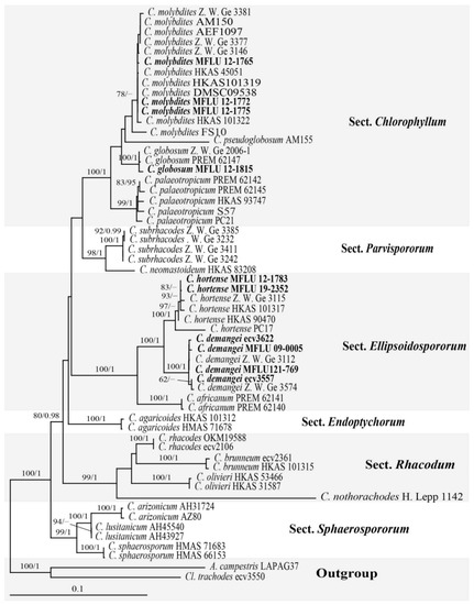 Figure 2 indicates the maximum likelihood phylogenetic tree of Chlorophyllum species based on nrITS sequences. Data from 126 collections were included, and the alignment dataset comprised 809 characters (including the gaps). Six clades were distinguished, all receiving high bootstrap support. Thai taxa clustered into two sections as in an analysis of combined sequences data (Figure 3).