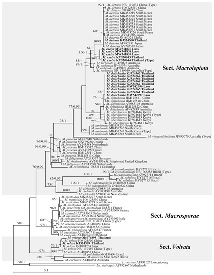 Maximum parsimony tree of Macrolepiota based on analysis of nrITS sequences. Bootstrap values for maximum likelihood equal to or greater than ≥60 and Bayesian posterior probabilities ≥0.95 are placed above the branches. Abbreviations are as follows: La. = Leucoagaricus, L = Lepiota, and M = Macrolepiota. All taxon names in bold are new sequences in this study. Leucoagaricus meleagris (Gray) Singer and Lepiota cristata (Bolton) P. Kumm. are used as outgroup. Country, type, and GenBank accession number are indicated after each species name.