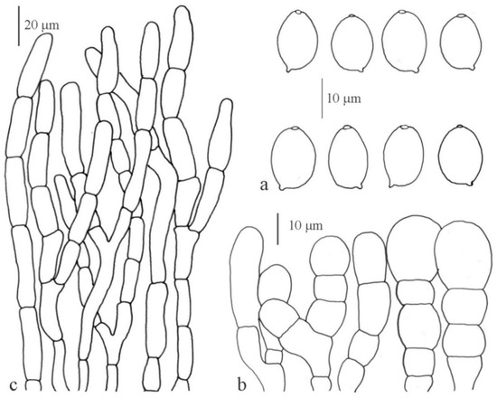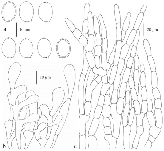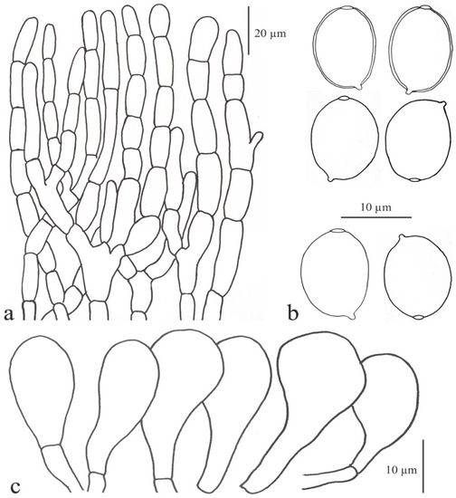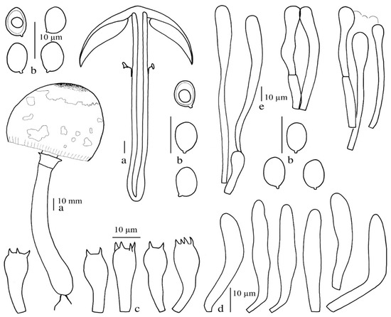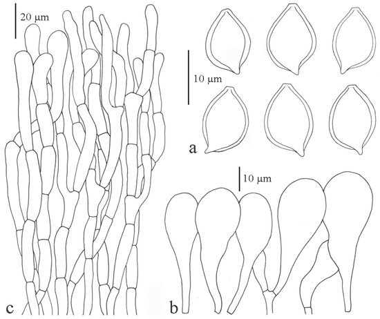 The micromorphology was illustrated from dried material: basidiospores, basidia, and cheilocystidia from the lamellae and the structure of the pileus covering, using a drawing tube attached to an Olympus CX-41 research compound microscope. The original color of all characteristics was observed in water (H2O) and 3–10% of potassium hydroxide (KOH), and chemical reactions were observed using Melzer’s reagent, Cotton Blue, and Cresyl Blue; line drawings were made of material mounted in Congo Red in ammonia. A total of 25 basidiospores, 15 basidia, and cheilocystidia per collection were measured. Spores were measured in side-view. The notation [50/2/2] indicates that the measurements were made on 50 basidiospores in 2 samples in 2 collections; the size averages are given in the description, while quotient (Q) of length and width average was calculated to indicate the basidiospore shape. The technical terms used for the descriptions followed those of Vellinga and Noordeloos [26].