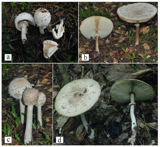 Fresh basidiomata of Chlorophyllum globosum in situ. (a) MFLU 12-1815. (b,c) MFLU 192357. (d) MFLU 10-0555.
