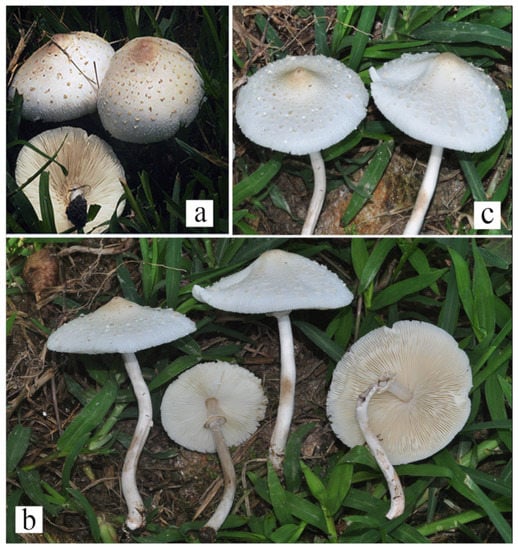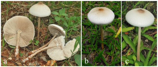 Fresh basidiomata of Chlorophyllum hortense. (a) MFLU 12-1783. (b,c) MFLU 19-2352.