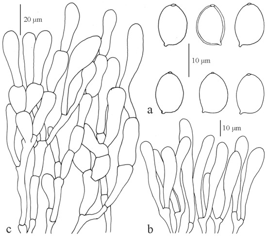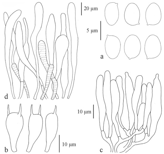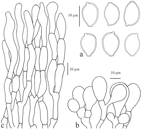 Basidiospores [50,2,2] 4.5–6 × 3.5–4 µm, avl × avw = 5.34 × 3.78 µm, Q = 1.3–1.5, avQ = 1.4, ellipsoid-ovoid in frontal view, ellipsoid in side-view, thick-walled, smooth, hyaline to pale-brown, without a germ pore. Basidia 10–12 × 5.5–7 µm, obovoid, short clavate to ellipsoid, thin-walled, hyaline, 4-spored. Pleurocystidia absent. Cheilocystidia 10–16 × 5–8 µm, short clavate to clavate, ellipsoid, some branched, slightly thick-walled, hyaline. Pileus covering an irregular epithelium composed of globose to subglobose (7.5–25 µm wide) cells in the upper layer, broadly ellipsoid to oblong cells (10–62 × 5–15 µm) in the lower layer, thin-walled, smooth, with pale-brown to brown parietal and intracellular pigments, with pale-brown to hyaline, up to 7 µm wide hyphae at base of the epithelial layers. Stipe covering an irregular epithelium same as on pileus. Clamp connections absent.