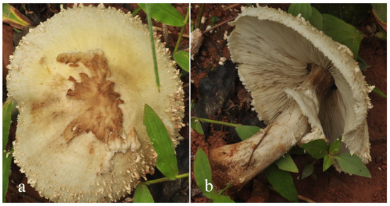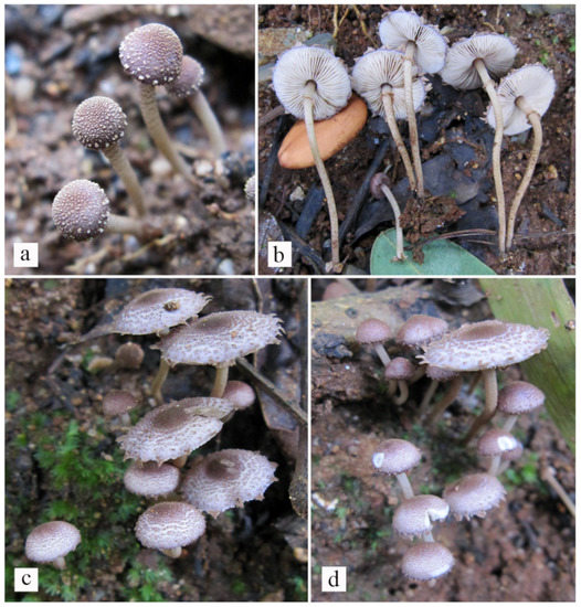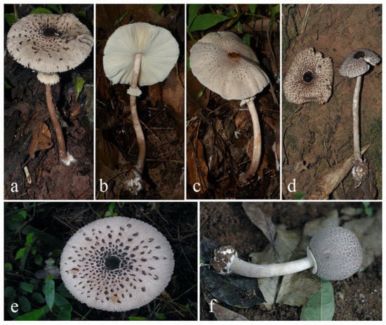 - Sysouphanthong, P.; Hyde, K.D.; Vellinga, E.C.; Chukeatirote, E. Diversity of Lepiota (Agaricales) in northern Thailand. Mycol. Int. J. Fungal. Biol. 2013, 4, 22–28. [Google Scholar]
