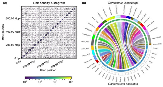 (A) Hi-C interaction heat map for Trematomus loennbergii. (B) Collinear relationship between T. loennbergii and Gasterosteus aculeatus. Alignment was accomplished with SyMAP v3.4. The colored blocks represent T. loennbergii scaffolds, and the white boxes represent G. aculeatus chromosomes. Blue and green bars represent genes of G. aculeatus and T. loennbergii, respectively. Connections within the circle represent alignment between the two assemblies.