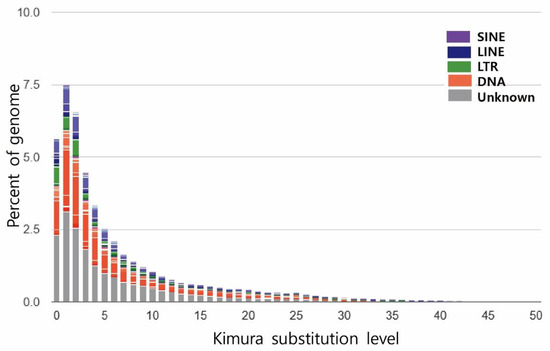 A de novo library of repeat sequences was constructed based on the Purge Haplotigs-processed genome using RepeatModeler ver. 1.0.3 (RRID:SCR_015027) [37] consisting of RECON ver. 1.08 [37] and RepeatScout ver. 1.0.5 (RRID:SCR_ 014653) [38]. Tandem Repeats Finder ver. 4.09 [39] was used to predict consensus sequences and classify information for each repeat and tandem repeat, including simple repeats, satellites, and low-complexity repeats. RepeatMasker ver. 4.0.9 (http://repeatmasker.org, accessed on 30 April 2021) was used to mask interspersed repeats and low complexity DNA sequences, and calculate Kimura distance-based copy divergence for each types of repeat motifs with the default settings.