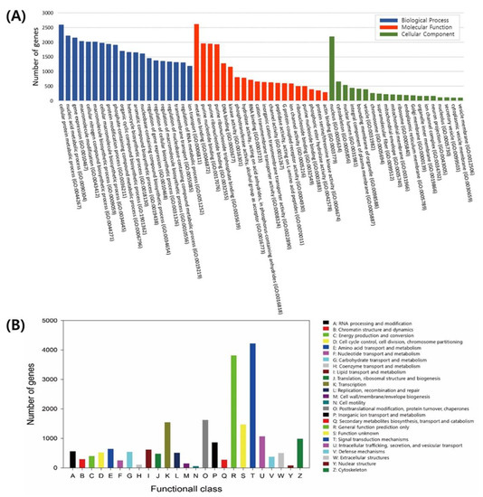 (A) Gene ontology (GO) annotations for the predicted genes within the Trematomus loennbergii genome. The horizontal axis indicates the classes of the 5-level GO-annotation, and the vertical level axis indicates the number of genes in each class. (B) Eukaryotic Orthologous Groups (KOG) classification of the predicted genes within the T. loennbergii genome. Results are grouped into 25 functional classes according to their functions. The horizontal axis indicates each class, and the vertical level axis indicates the number of genes in each class.