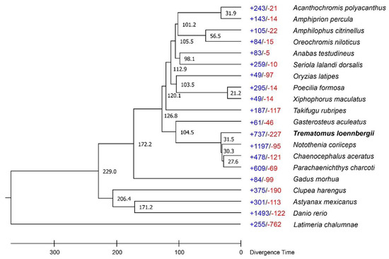 Phylogenetic analysis of Trematomus loennbergii within the teleost lineage and gene family gain-and-loss analysis, including the number of gained (+) and lost single-copy orthologous gene families (−). Each number of branch site indicates divergence times between lineages.